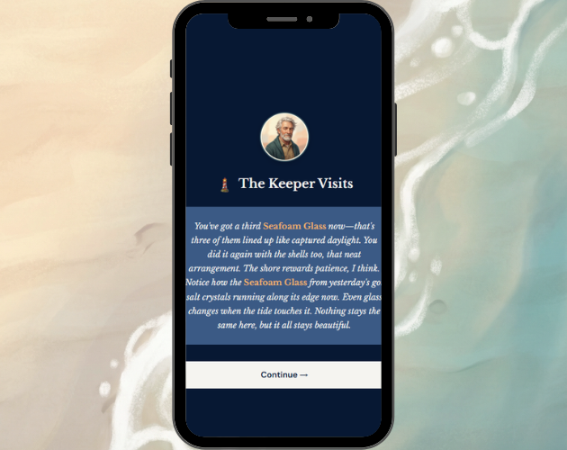 - A lighthouse keeper who notices what you do (personalized, different each visit)